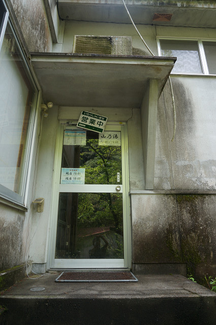 斜めになった営業中の張り紙「山の湯」と書いてある