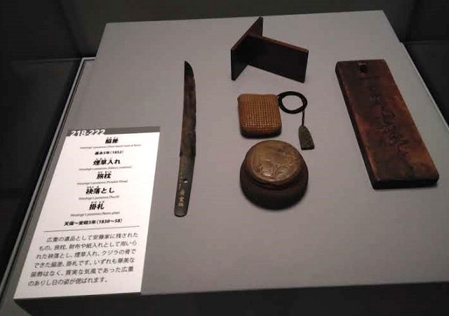 「広重の死絵と実際に使っていた脇差・煙草入れ・旅枕・袂落とし(首からぶら下げて袂に入れる財布)・掛札(表札の様なもの)」