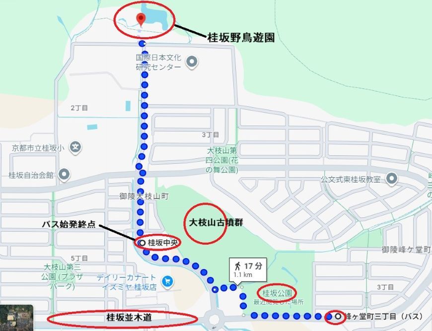 阪急桂駅西口から桂坂中央行のバスで「峰ケ堂町三丁目」で降りるのがベストのようだ
