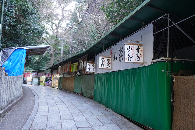 駅から商店街をぬけ徒歩15~20分 緩やかな坂道 参道には多くの屋台が並んでいるが早朝の為 開いている店は僅か