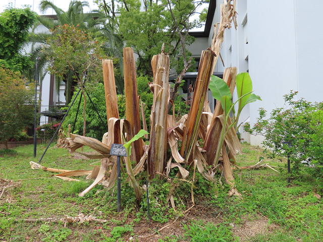 バナナ(バショウ科) 開花後は地上部は枯れ吸芽の株分けで増殖する