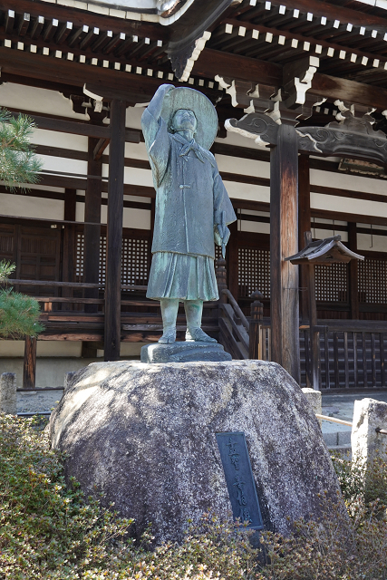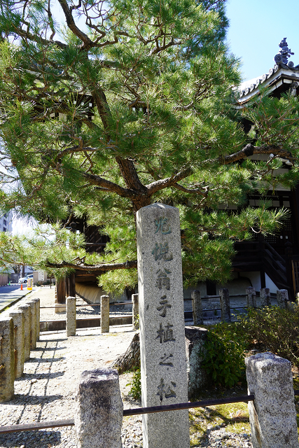 本堂左前の「等伯像」と「光悦手植えの松」
