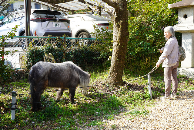 鳥居をくぐると 犬の散歩かと思ったら大きすぎる ポニーと散歩