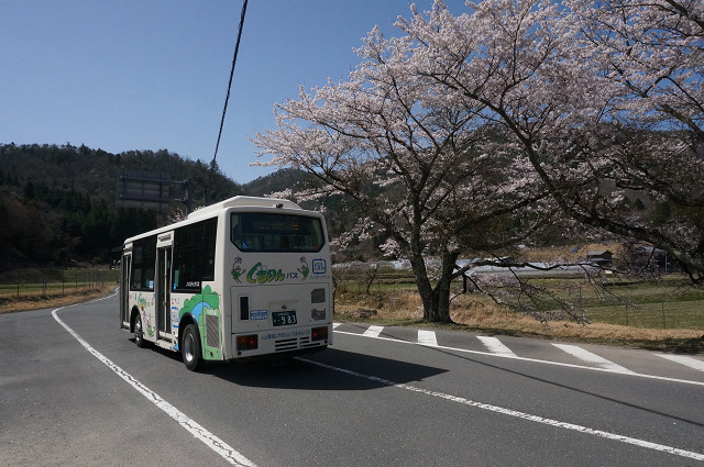 桜の下のバス停にバスが来た