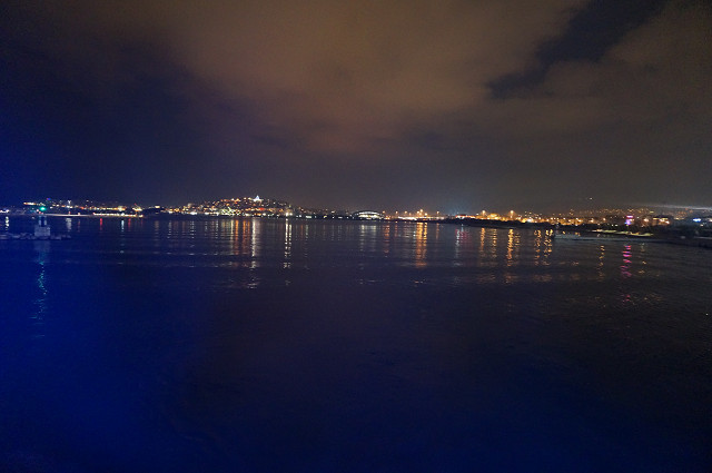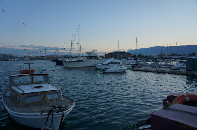 夕闇迫る港に着く