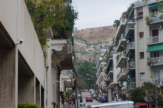 アクロポリスの丘がどの筋からも見える