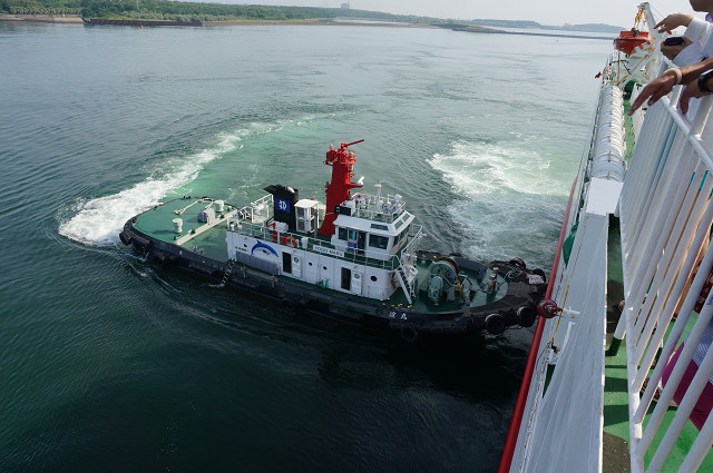 このボートが大きなフェリーの船尾をスクリュー全開で押して半回転させ