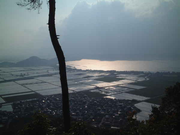 田植えの時期の田んぼが琵琶湖と連なって その境がわからない