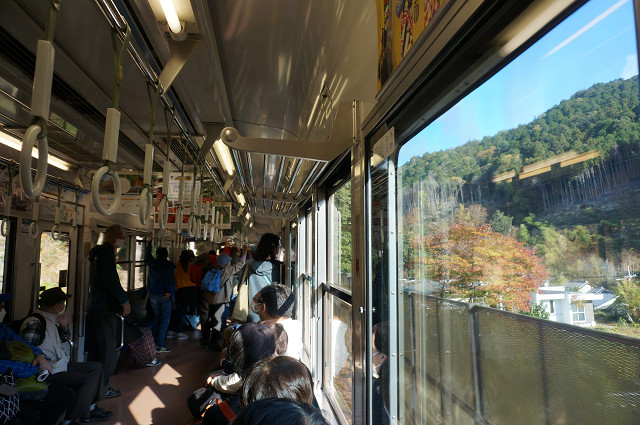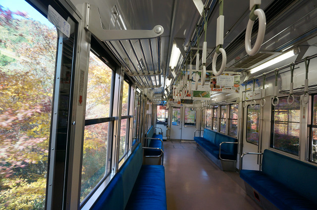 折り返しの電車を待って殆ど人が乗っていない車内から紅葉を狙うも