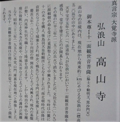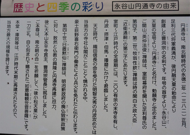 『高源寺は、1325年(鎌倉時代)に遠谿祖雄(えんけいそゆう)禅師によって開創された、臨済宗中峰派(りんざいしゅうちゅうほうは)(幻住派(げんじゅうは)とも)の本山です。甲斐(山梨)の栖雲寺(せいうんじ)が東天目と呼ぶのに対して、高源寺は西天目(にしてんもく)と呼ばれ、丹波屈指の名刹として知られています。