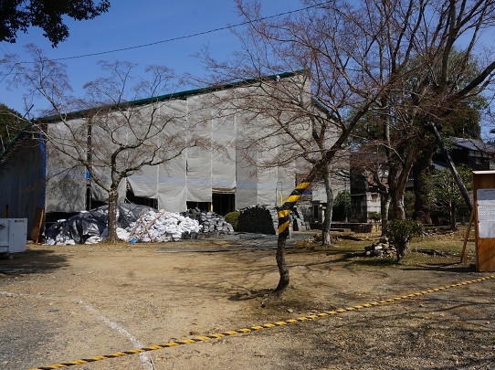 「誕生寺」は修理中なのか覆いに隠れ下には瓦も積みあがられていた