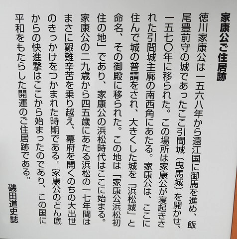『徳川家康は29歳~45歳までの17年間を浜松城で過ごしました。有名な姉川、長篠、小牧・長久手の戦いもこの期間中の出来事で、特に元亀3年(1572)の三方ヶ原の合戦は、関ヶ原の合戦以上の激闘であったと伝えられています。家康にとって、浜松在城17年間は、徳川300年の歴史を築くための試練の時代だったと言えるでしょう。』