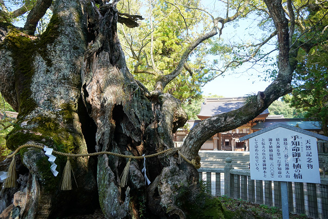 『本殿正面にそびえる御神木は「小千命-おちのみこと(乎知命)御手植の楠」と呼ばれ、