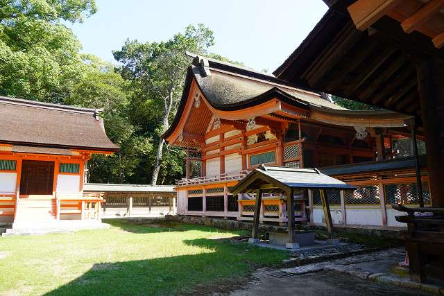 三間社流造り(さんげんしゃながれづくり) 胡粉・丹塗り。屋根檜皮葺き。室町初期に再建