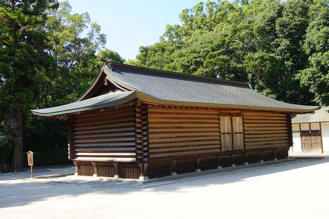 切妻造り(きりづまづくり)。素木。唐破風付き向拝。屋根檜皮葺き。大山祇神社拝殿 国指定重要文化財室町初期に再建