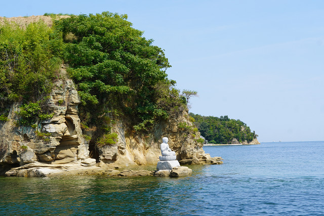 『ずぅっとむかしの話じゃ。宮窪の沖に鯛崎島というこんまい島があろが。その島の磯の上に石の地蔵さまが立っとってのう、ある年の春のことじゃが、子クジラがようけと親クジラとが遊んどったんじゃ。子クジラはみんな仲よう遊んどるんでのう、親クジラは安心してねや、うとうとと大けな岩の上で昼寝を