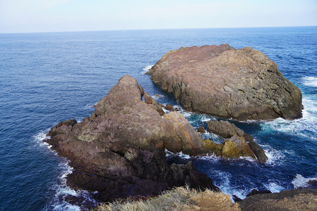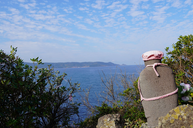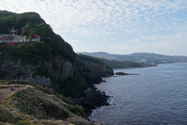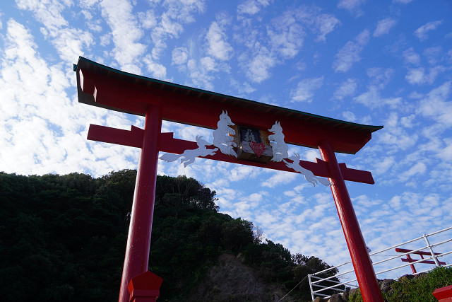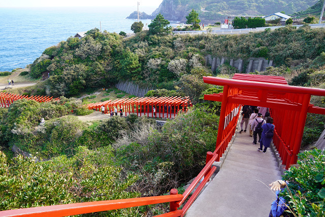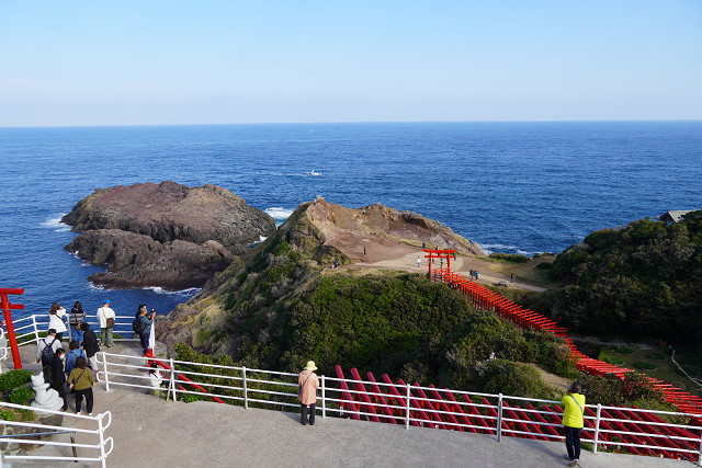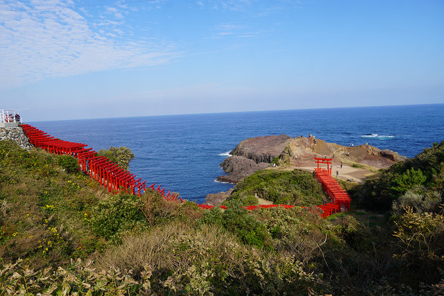 場所が海岸の絶壁と海の青さと鳥居の朱の景観は素晴らしい
