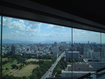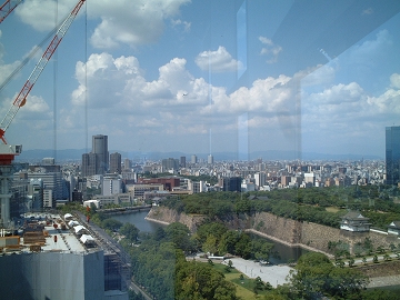 圧巻は暗くしてビデオを見せ 終るとカーテンが上がると 眼前には大阪城やビル群 それに眼下には