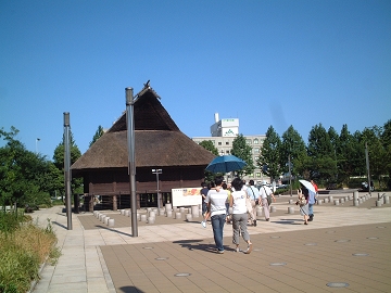 「歴史館」の前の広場は遺跡のあったところで 人が立っている所のタイルの色が