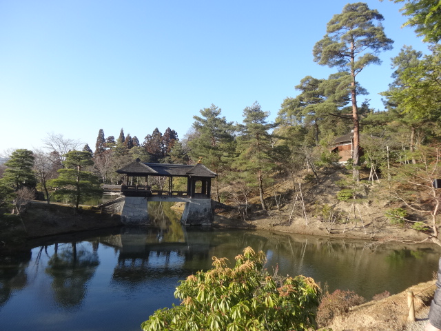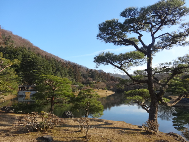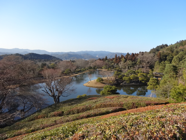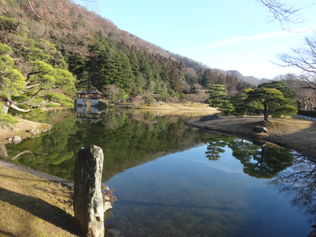 その浴龍池を一望におさめる東南の高みには「隣雲亭」 中島に「窮邃亭(きゅうすいてい)」