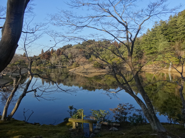 池の反対には夕日に沈む田畑と遠くに京の町