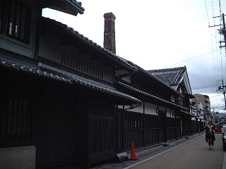 高瀬川沿いの漆喰の白壁と焼板の黒塀 煉瓦の赤い煙突 この街の一角は「白と黒と赤」の時代村。
