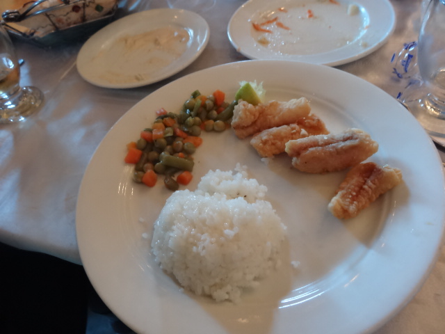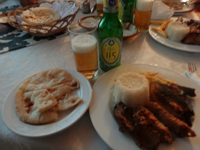 昼間のレストランの隣 ナイル川の船上レストランで鳥と魚と肉のミックスグリルの夕食 だって