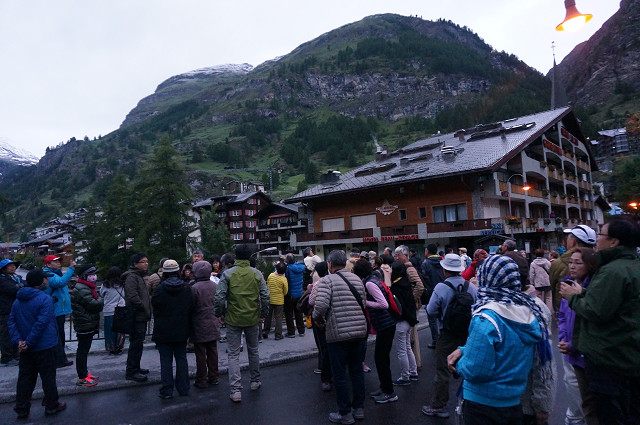 早朝 日の出のマッタホルンを見ようと添乗員が呼びかける
