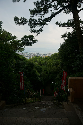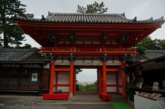 下の駐車場からは見上げるほどの階段の上に門がある