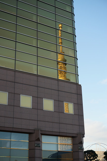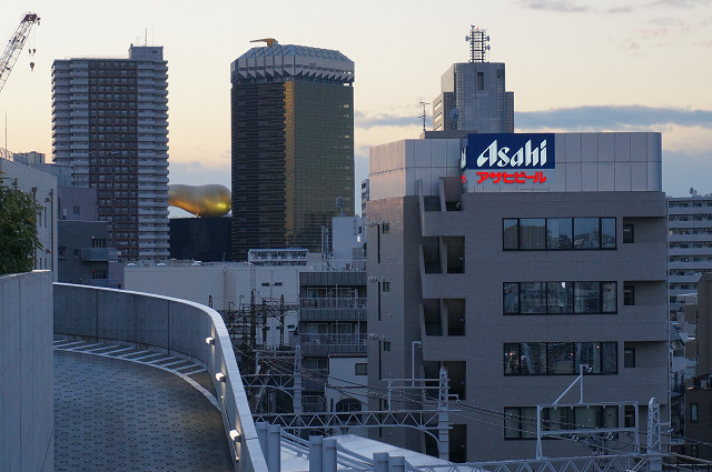 橋を渡ると左手に墨田区役所・スカイツリー・アサヒビール本社ビルと通称「うんこビル」