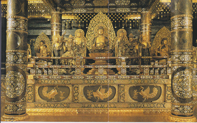 光堂は三代の棺を納め 三尊の仏を安置す