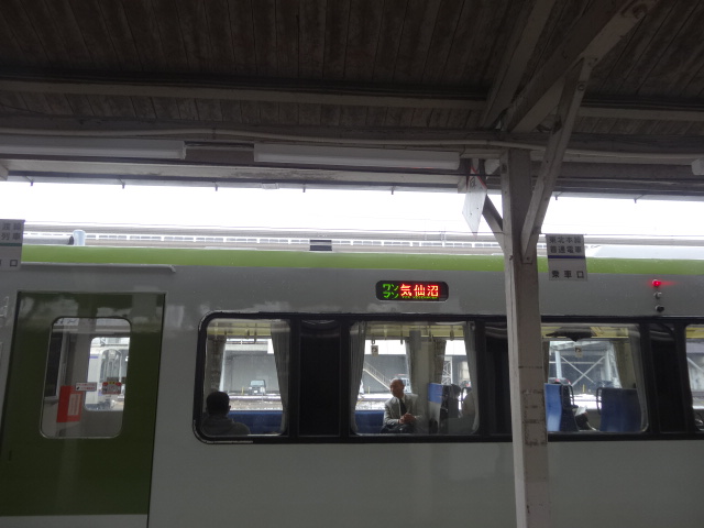 隣のホームから気仙沼行きが出る(右上)