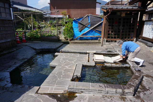 湧水前の豆腐屋のおばさんが荒い物をしていた