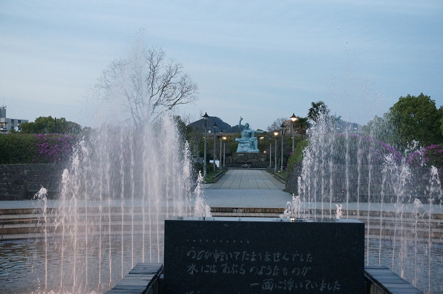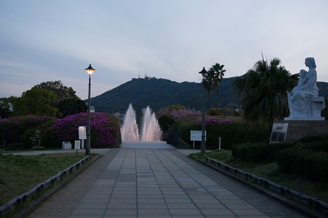 平和の像から噴水 稲佐山を望む