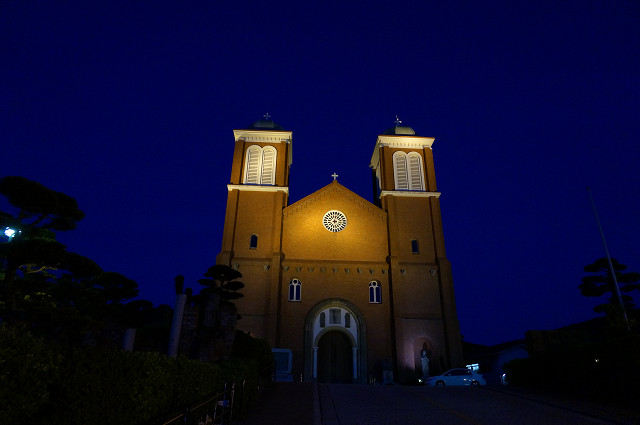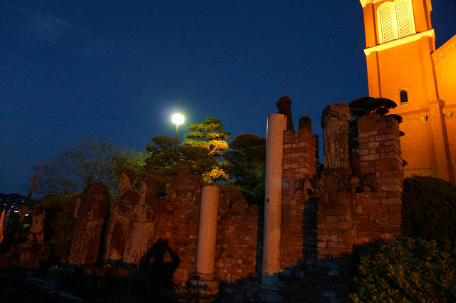 教会の前には被爆後の残像がモニュメントとしてライトアップされている