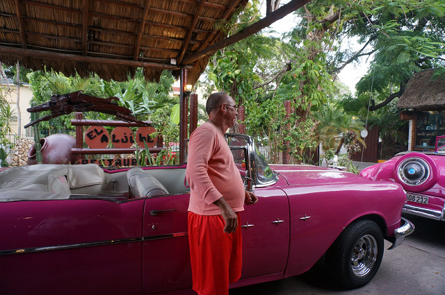 80才前後のかっぷくのいいキューバ人ガイド 胸に日の丸を付けている