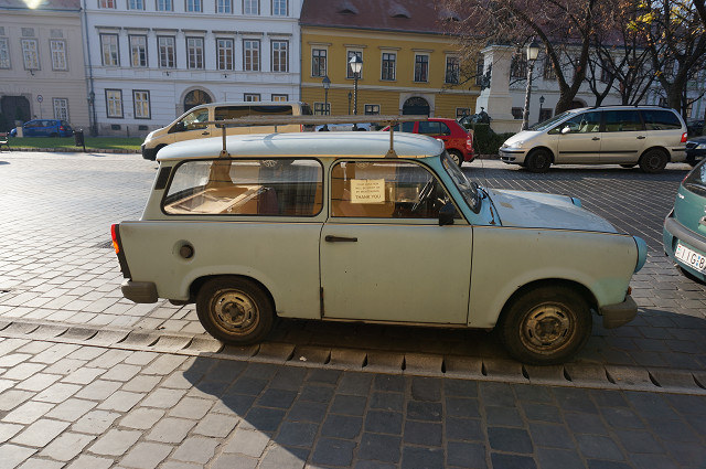 路上に観光用に東ドイツ製「トラバント」がおいてある ボディーは段ボールである オペラ座