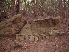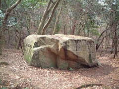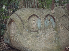 人家の裏山に分け入ってみると 薄暗い山のすそに 「廃寺跡の石碑」と岩に仏の彫刻が施されたものがころがっている