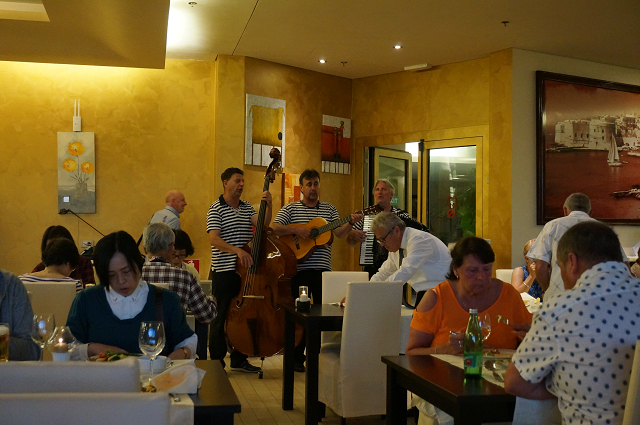 モーツアルト像の前のレストランに入り中にいた2人の若い男性従業員に昨夜のホテルに