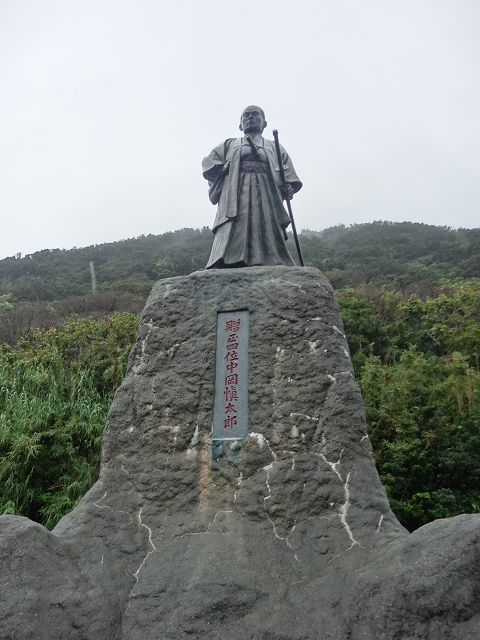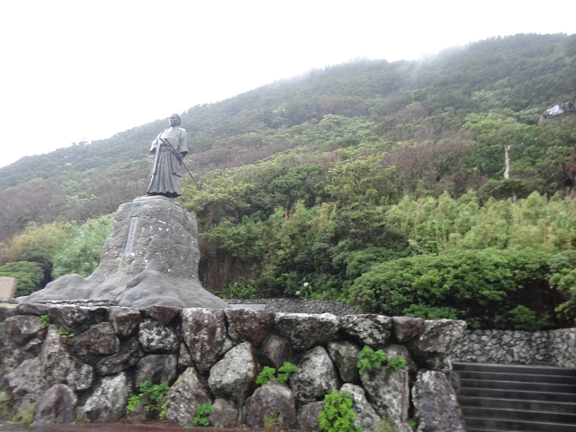 バス停の前が今日と明日の2日間泊まる「民宿室戸荘」と観光案内所と中岡慎太郎の大きな像が並んでいる