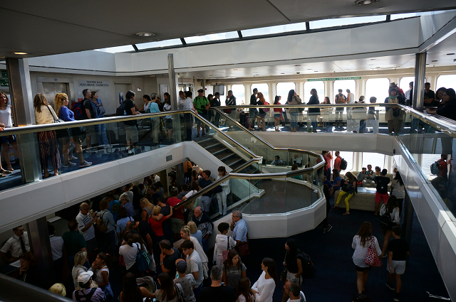国境を渡るので飛行機と同じで入出国の手続きや荷物検査がある